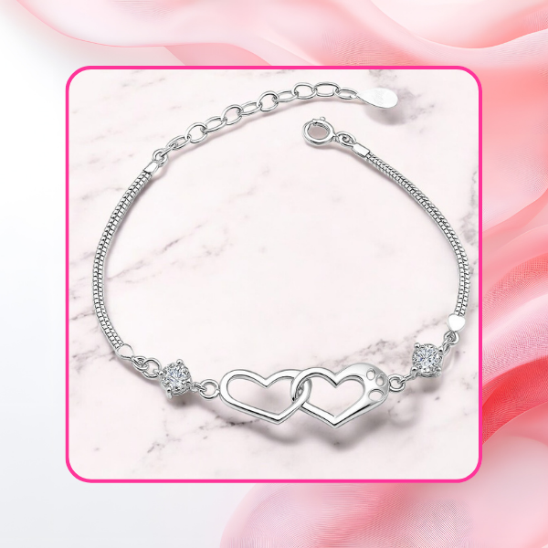 Double Heart Shape Silver Plated CZ Crystal Bracelet for Women & Girls